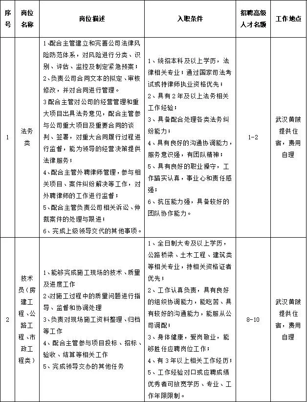 本次社会招聘包含武汉环通建设集团财务类、法务类、技术员、预算员和综合类工作人员等 5 个岗位,拟招录人员 20 人(详见下面附件)