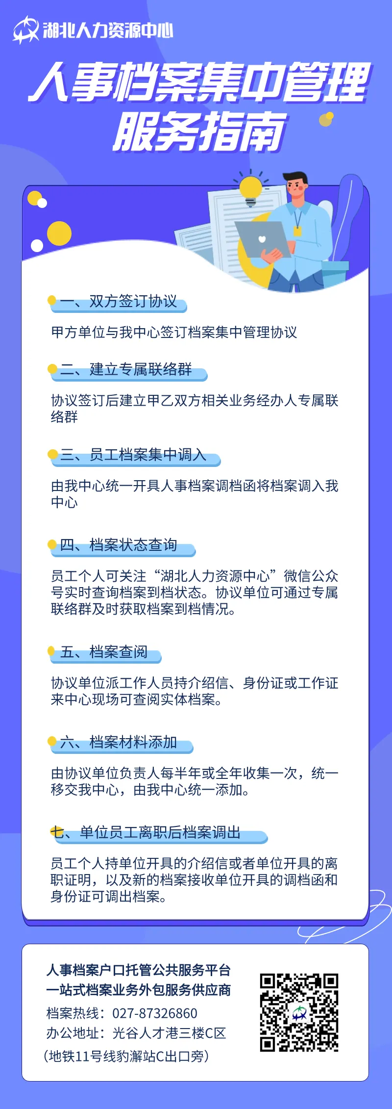 以上就是湖北人力资源中心人事档案集中管理服务指南,我们坚持档案管理“五化”并举,做到设施设备信息化、硬件配备标准化、档案整理规范化、管理制度精细化、管理模式高效化,为企事业单位提供专业的人事档案集中管理服务!